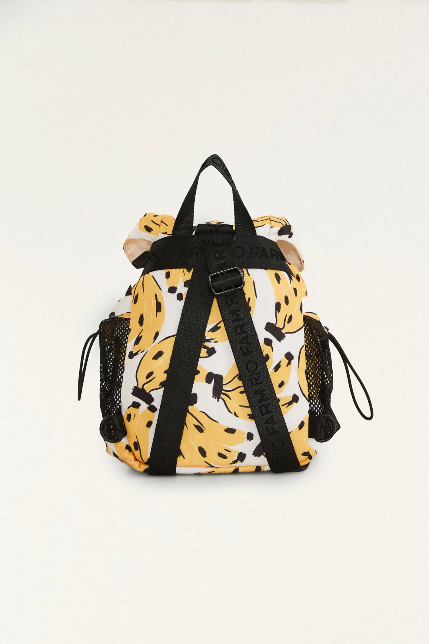 -12%bolsa pipoquinha bossa banana off white, mochila feita em nylon com aba frontal sobreposta, tiras médias de gorgurão aplicadas com nome da marca em baixo-relevo na parte frontal, bolso frontal, bolso lateral em tela com puxador ajustável.